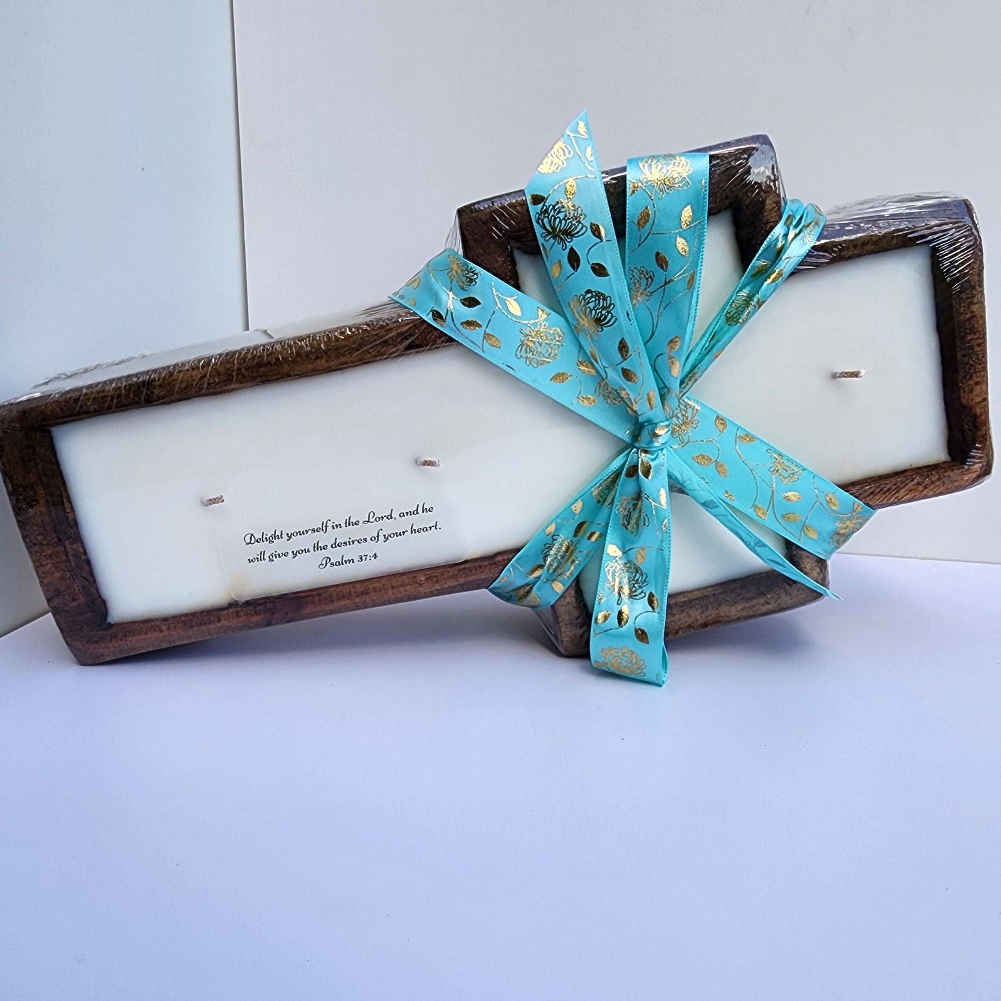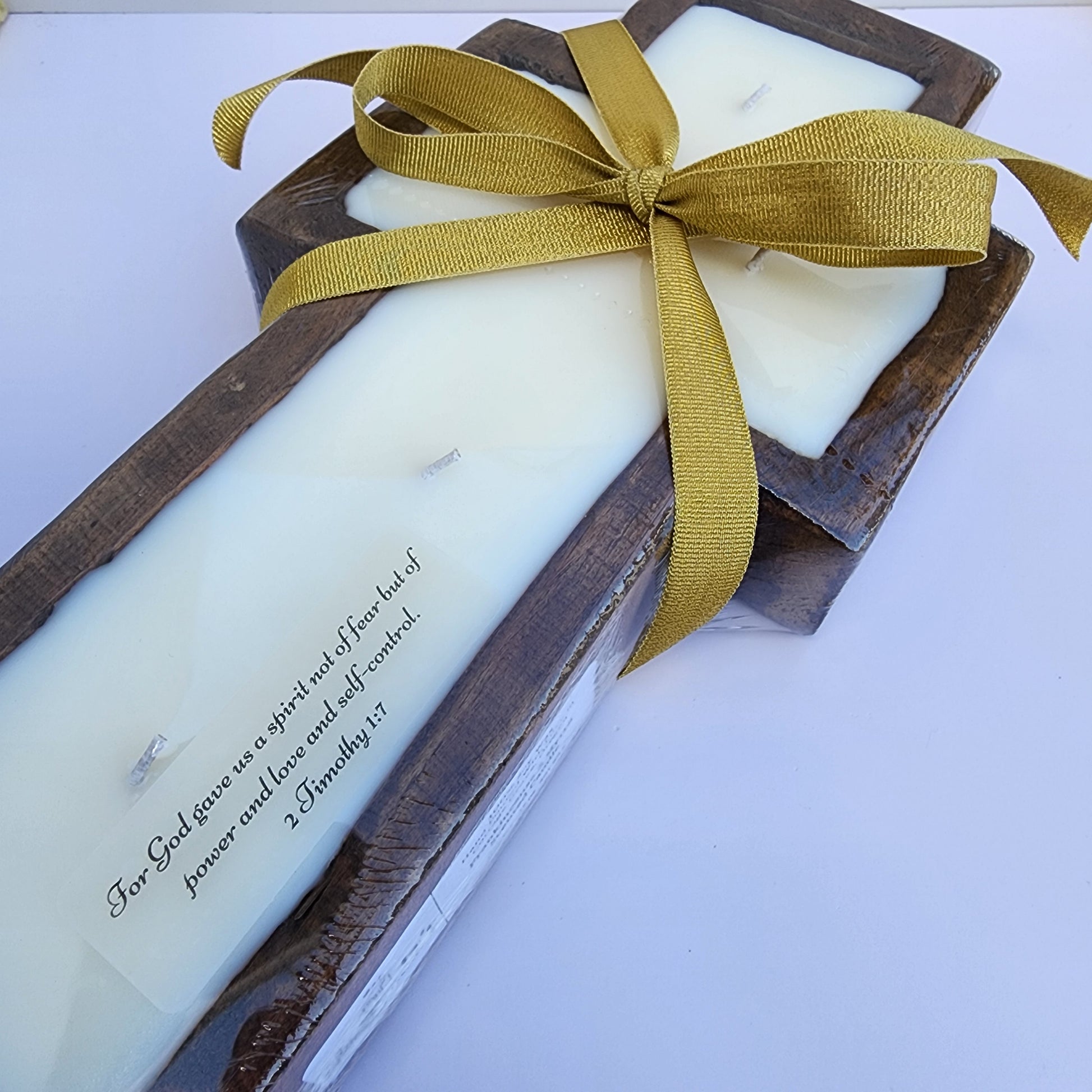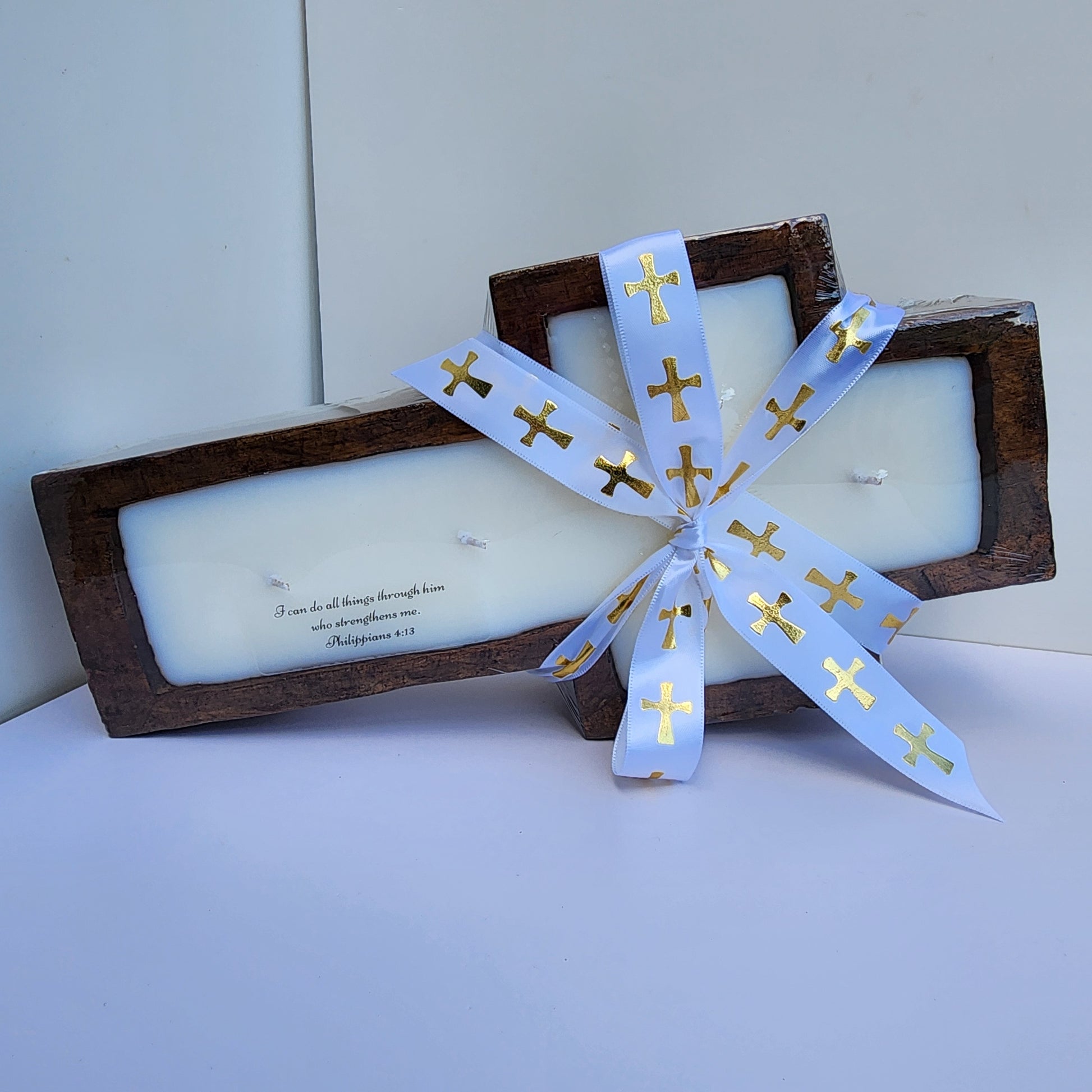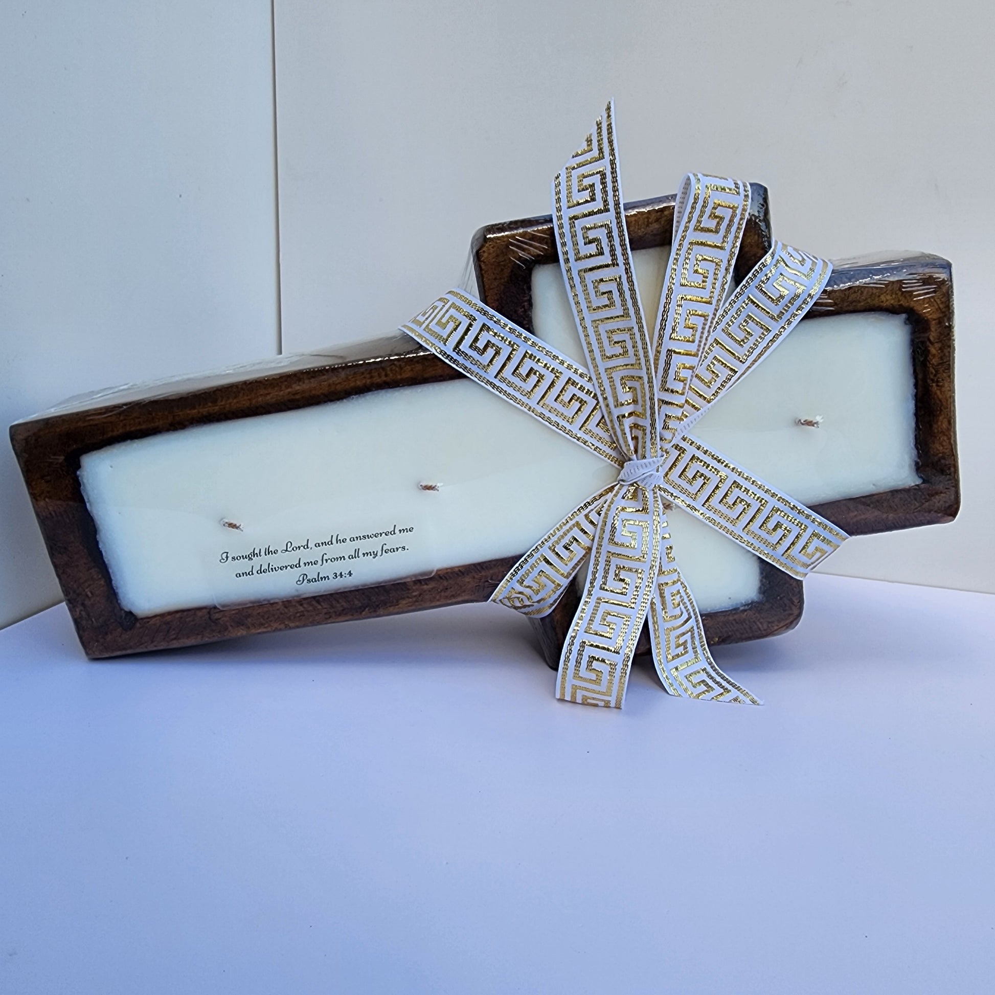 Illuminate your home with faith and fragrance. Our Handmade Cross Dough Bowl Candle is a beautiful blend of rustic charm and spiritual inspiration. Hand-poured in Oregon with 100% natural soy wax, this unique candle is cradled in a wooden dough bowl shaped like a cross—measuring approximately 12” long, 6” wide, and 2” deep, and holding about 17 oz of clean-burning wax making for the perfect Easter Candle to shine your light for Jesus, Faith Based, Christian Gift Ideas, Housewarming Gifts, and more!